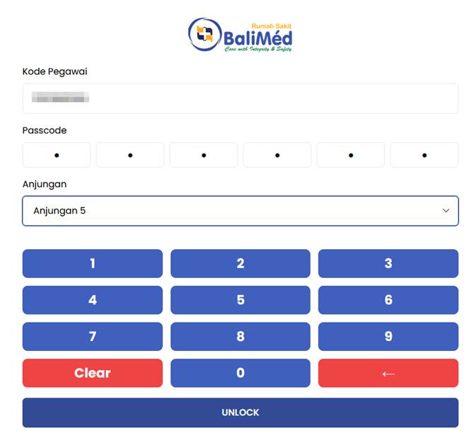 - Pilih aplikasi Anjungan pada desktop lalu masukan Kode Pegawai, Passcode Pegawai, dan Anjungan yang akan digunakan.