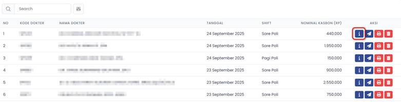 e. Pilih icon [ i ] untuk melihat detail Kasbon Dokter