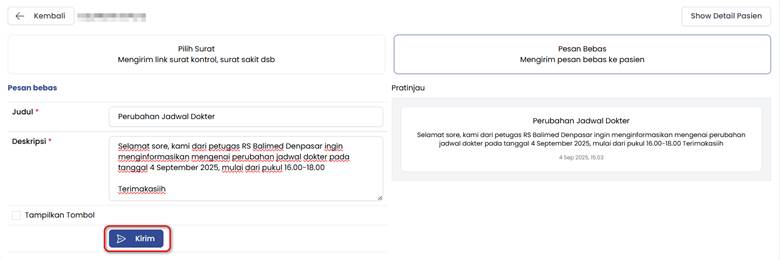 d. Pilih Mengirim Pesan Bebas ke Pasien untuk mengirim pesan seperti perubahan jadwal dokter, dokter tidak praktek, dll