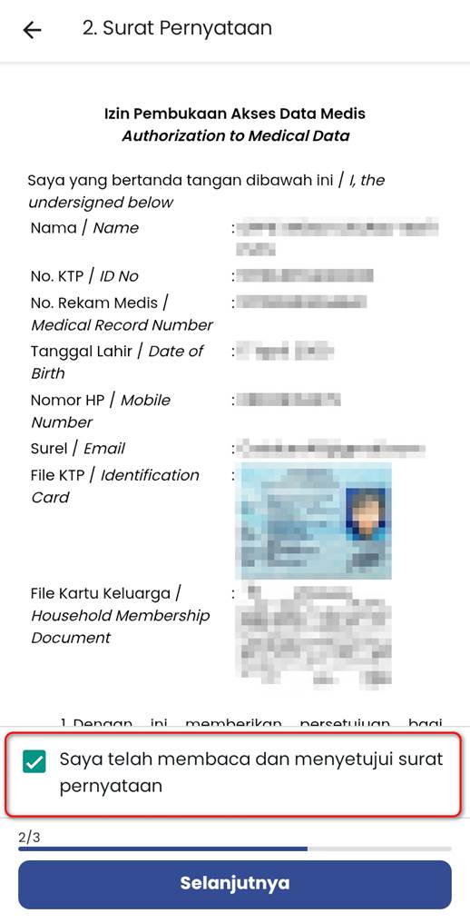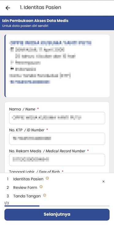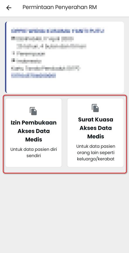 c. Pilih Izin Pembukaan Akses Data Medis jika pasien merupakan pemilik akun. Namun jika pasien merupakan anggota keluarga pilih Surat Kuasa Akses Data Medis