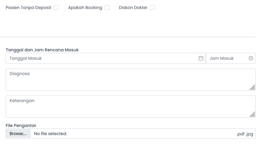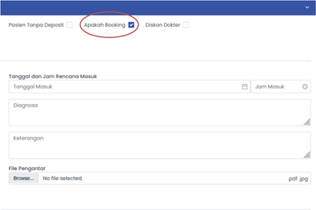 Lengkapi form tersebut sesuai dengan surat pengantar yang telah diberikan oleh dokter spesialis yang bersangkutan dan centang keterangan Apakah Booking agar sistem dapat melakukan penarikan data pada saat hari tindakan berlangsung. Jika sudah melengkapi form simpan data tersebut.