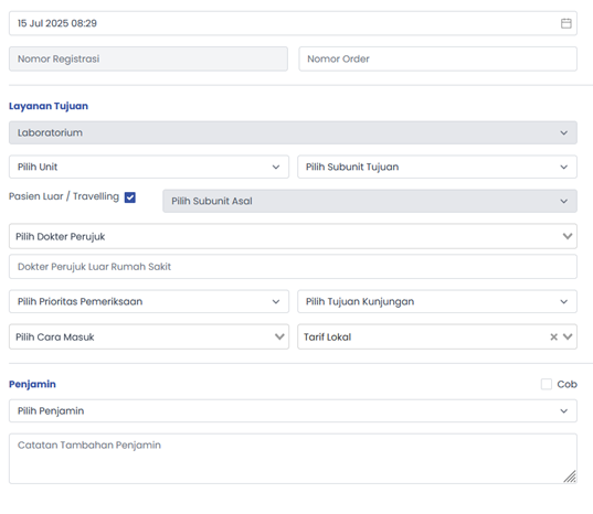 Pertama-tama pilih menu Daftar Pasien pada Dashboard SSO. Kemudian pilih fitur Laboratorium. Setelah memilih fitur tersebut akan muncul tampilan sebagai berikut.