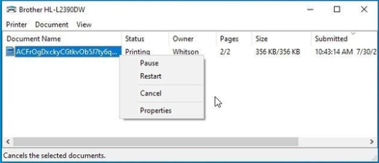 - Status: Status dokumen pada antrian yaitu spooling, paused, printing