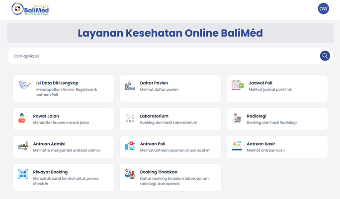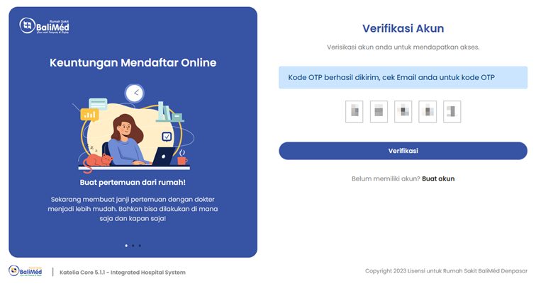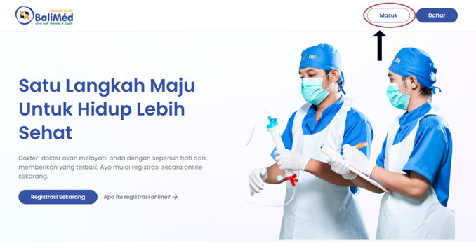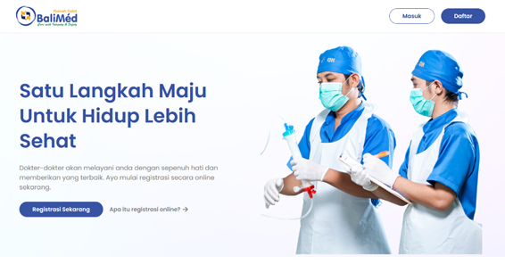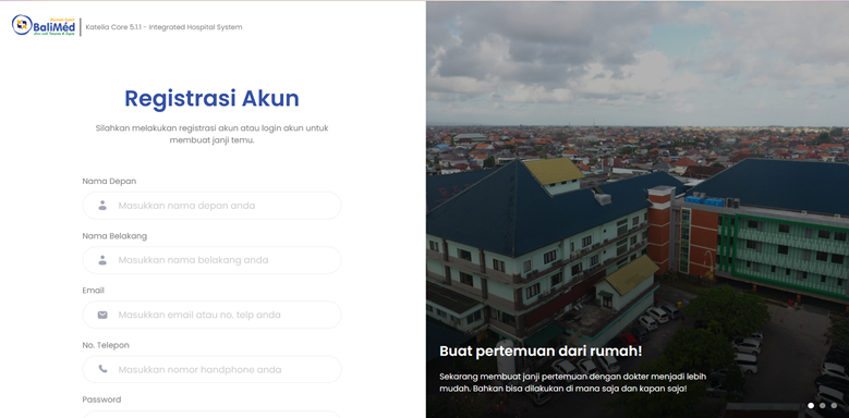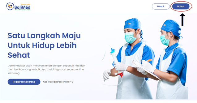 Jika pasien belum memiliki akun baik itu pasien baru maupun yang sudah pernah berobat ke RS Balimed Denpasar, dapat melakukan registrasi terlebih dahulu dengan memilih opsi Daftar pada pojok kanan-atas dashboard.