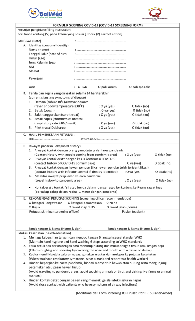 3. Di IGD, poli umum, poli spesialis penambahan pertanyaan dan penggunaan form screening