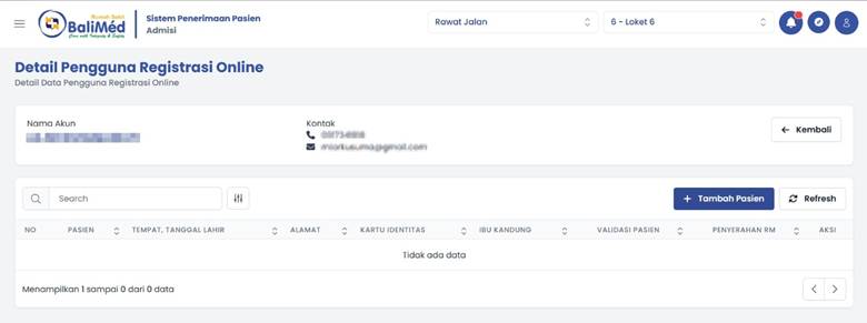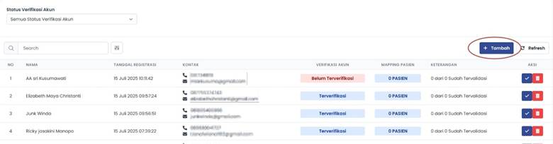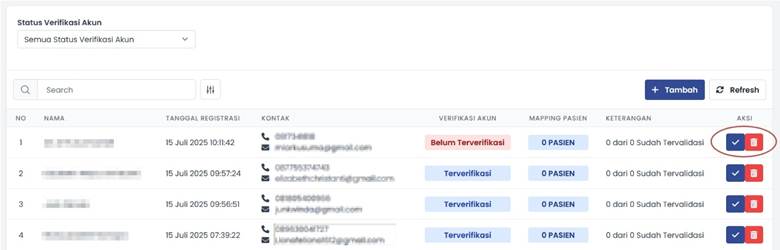 Jika pasien belum memiliki akun Regon kita dapat melakukan penambahan pada sistem dengan memilih menu Tambah pada tampilan. Namun jika pasien sudah memiliki akun sebelumnya, kita dapat memilih tombol centang pada kolom aksi.