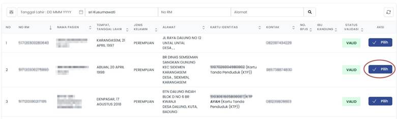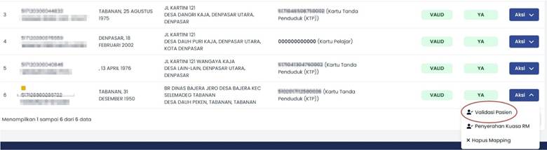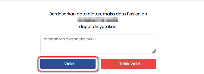Setelah melengkapi form tersebut pilih opsi Validasi Pasien pada kolom aksi, lengkapi kembali form yang tersedia lalu pilih opsi valid untuk melakukan Validasi.
