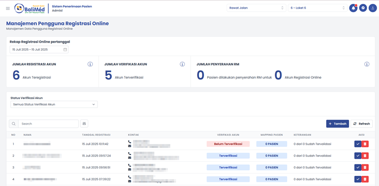 Berikut merupakan tampilan untuk Manajemen Pengguna Registrasi Online pada SSO. Pada fitur ini terdapat kolom yang memuat beberapa data seperti Nama Pasien, Tanggal Registrasi akun, Kontak Pasien, Status Verifikasi Akun, Mapping Pasien, dan keterangan jumlah akun yang sudah tervalidasi. Sebelum melakukan validasi pasien dapat membuat akun secara mandiri pada website Regon RS Balimed Denpasar melalui link berikut : https://regon.rsbalimeddenpasar.id/
