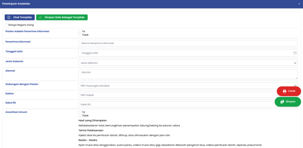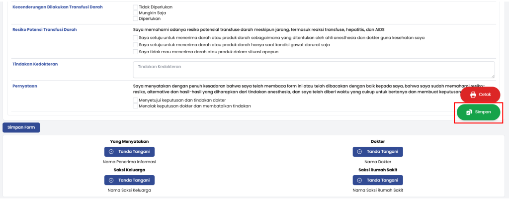 Penginputan Form Persetujuan Anestesi pada Katelia Core