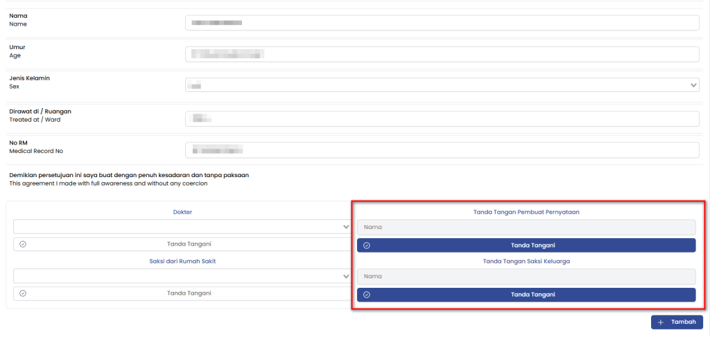 h. Pilih Tanda Tangan lalu masukkan Passcode atau Bubuhkan Tanda Tangan pada kolom Dokter maupun Saksi dari rumah sakit