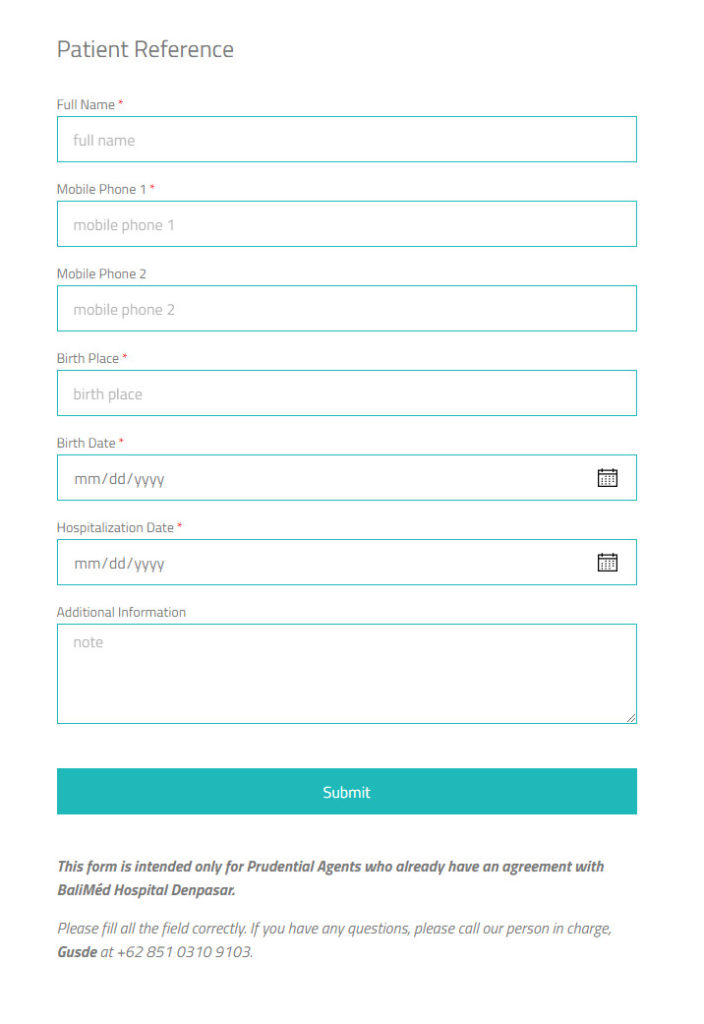 Halaman ini dapat diakses melalui https://balimedhospital.co.id/prudential-patient-reference/ atau secara otomatis setelah Agent login
